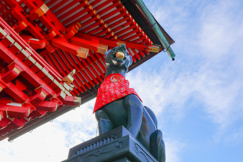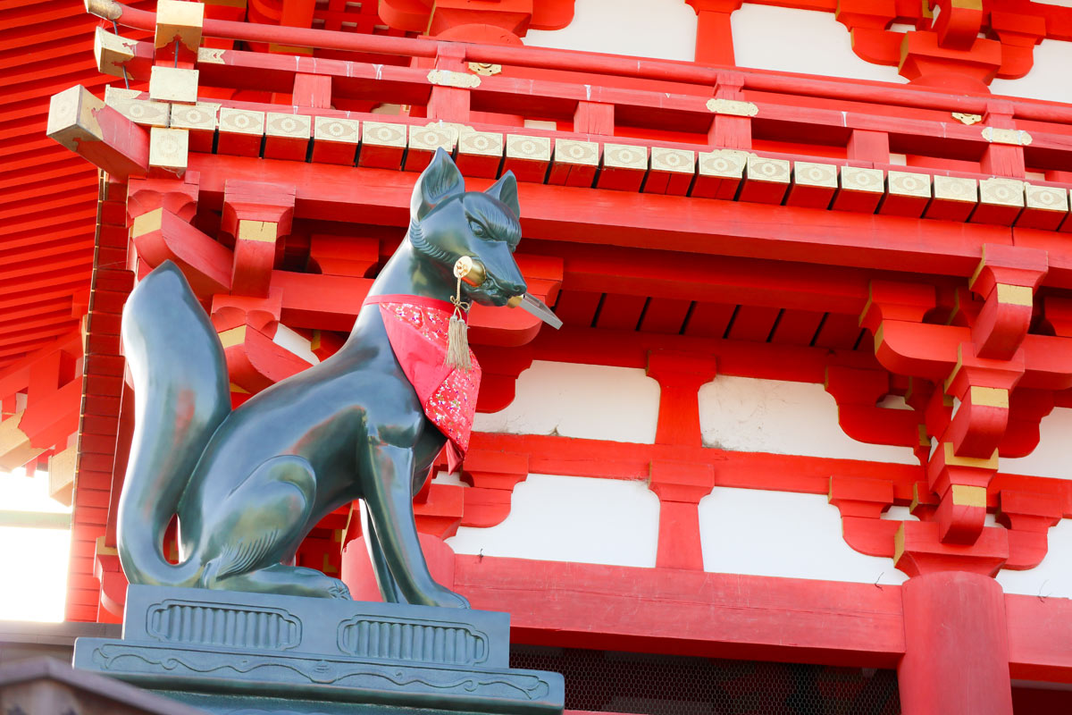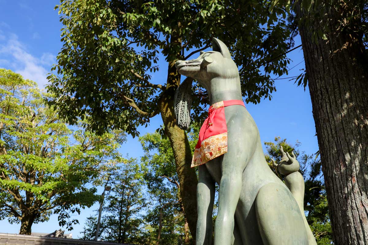 重要文化財の「楼門」前には、神様の使いである二体のキツネが鎮座する。