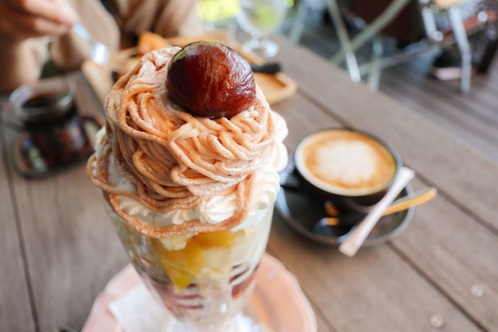 栗の渋皮煮と手作りクリームがのった「モンブランパフェ」は、これからの季節にぴったり。