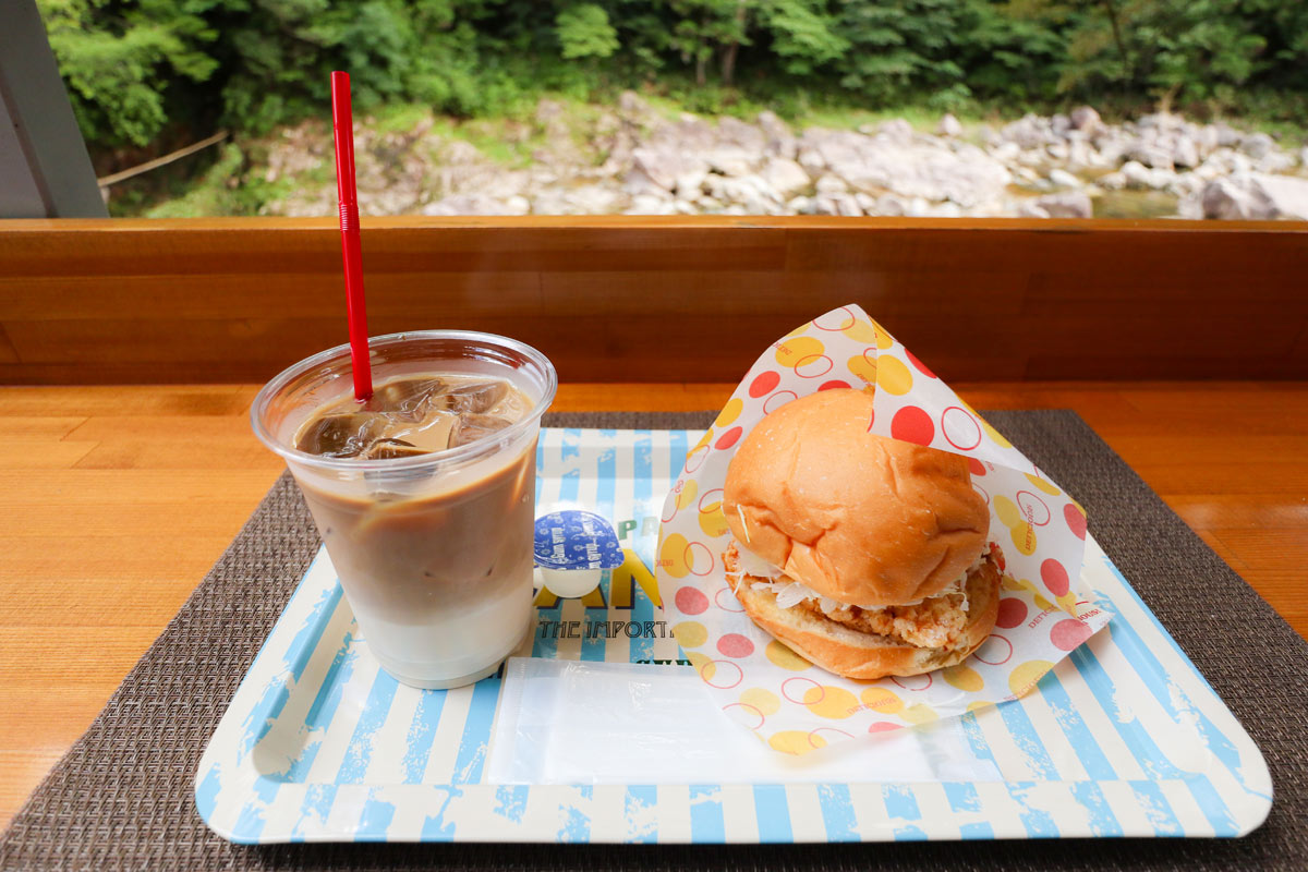 川のせせらぎに癒されつつ、ハンバーガーとカフェオレをいただきます!