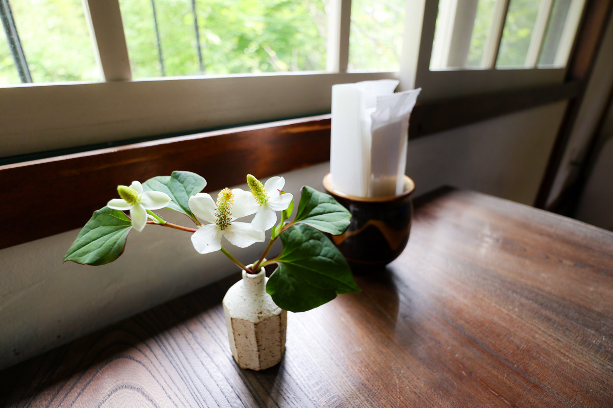 テーブルに飾られた花に、店主の素敵な心遣いを感じる。