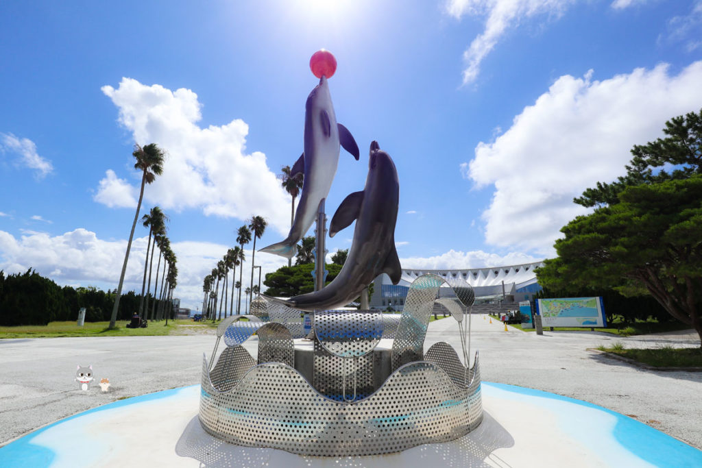 躍動感いっぱいのイルカのオブジェがお出迎え。