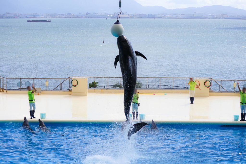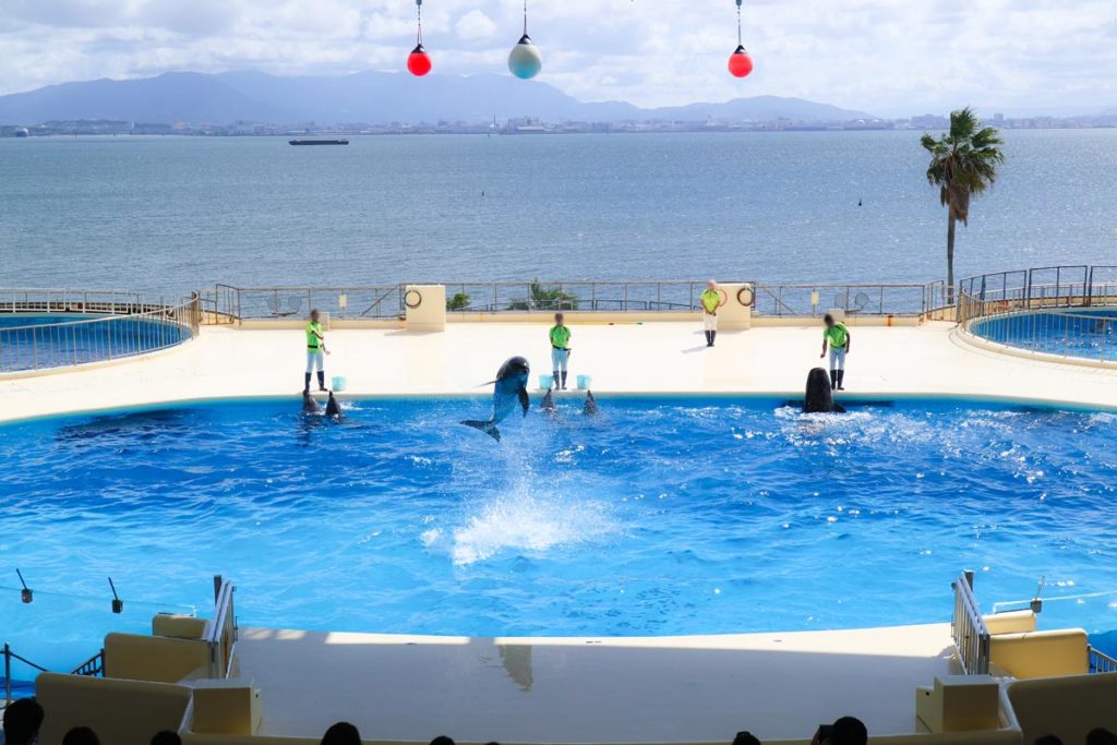 海が広がる見晴らしの良い「ショープール」でイルカショーを鑑賞