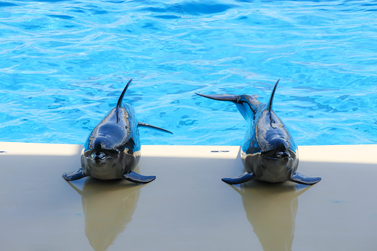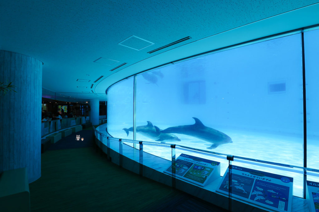 泳ぐイルカを間近で観察!館内レストランでランチタイムを満喫