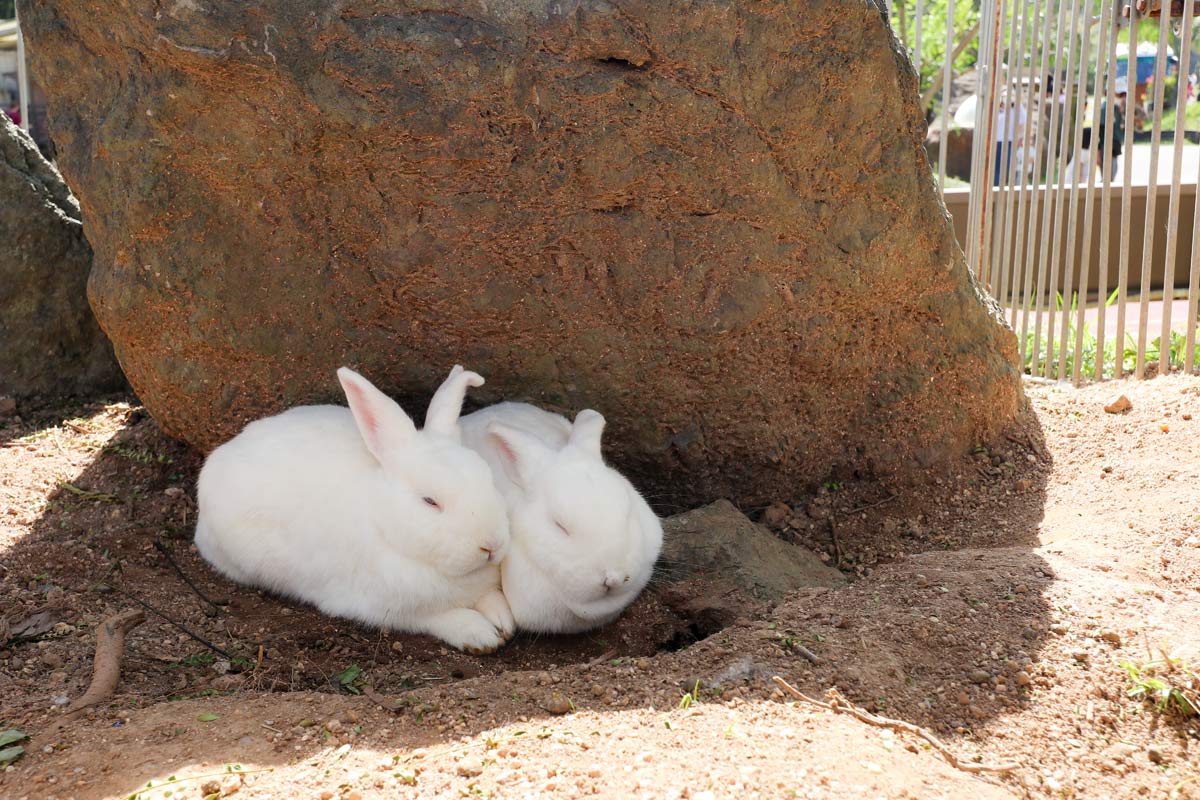 ふわふわかわいいうさぎたちは、岩の陰でお休み中。
