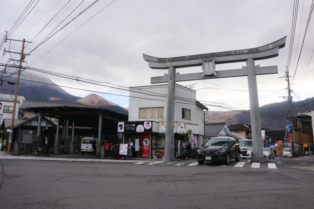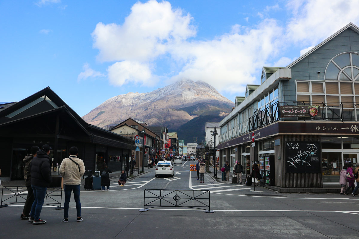 周りに高い建物がないため、どこからでも「由布岳」の姿を眺めることができる。