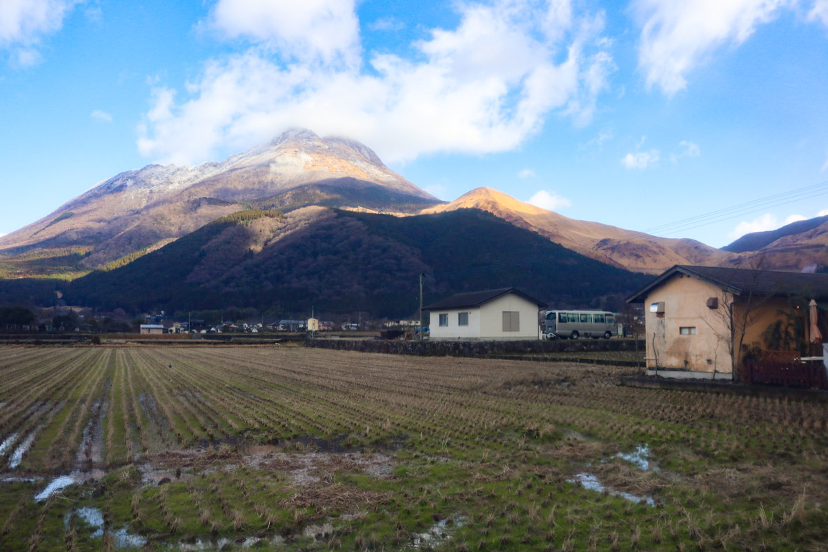 「由布院駅」を出発すると、目の前に雄大な「由布岳」とレトロな町並みが広がる。