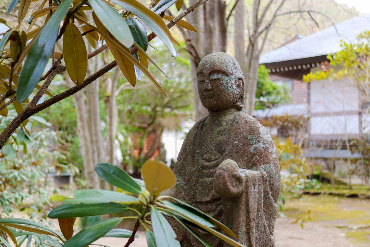 穏やかに微笑む、苔むしたお地蔵様。