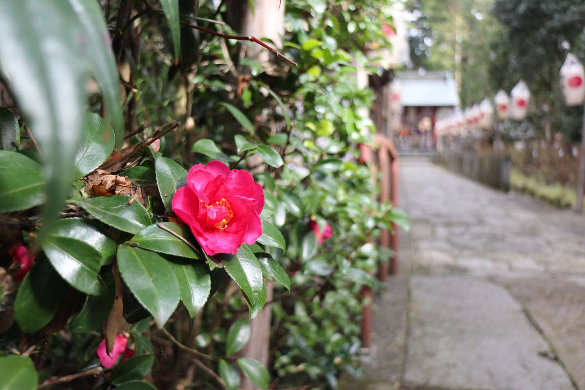 冬の境内を彩るのは、色鮮やかなサザンカ。