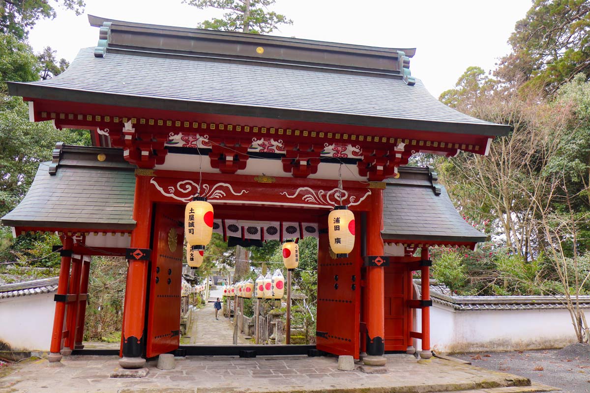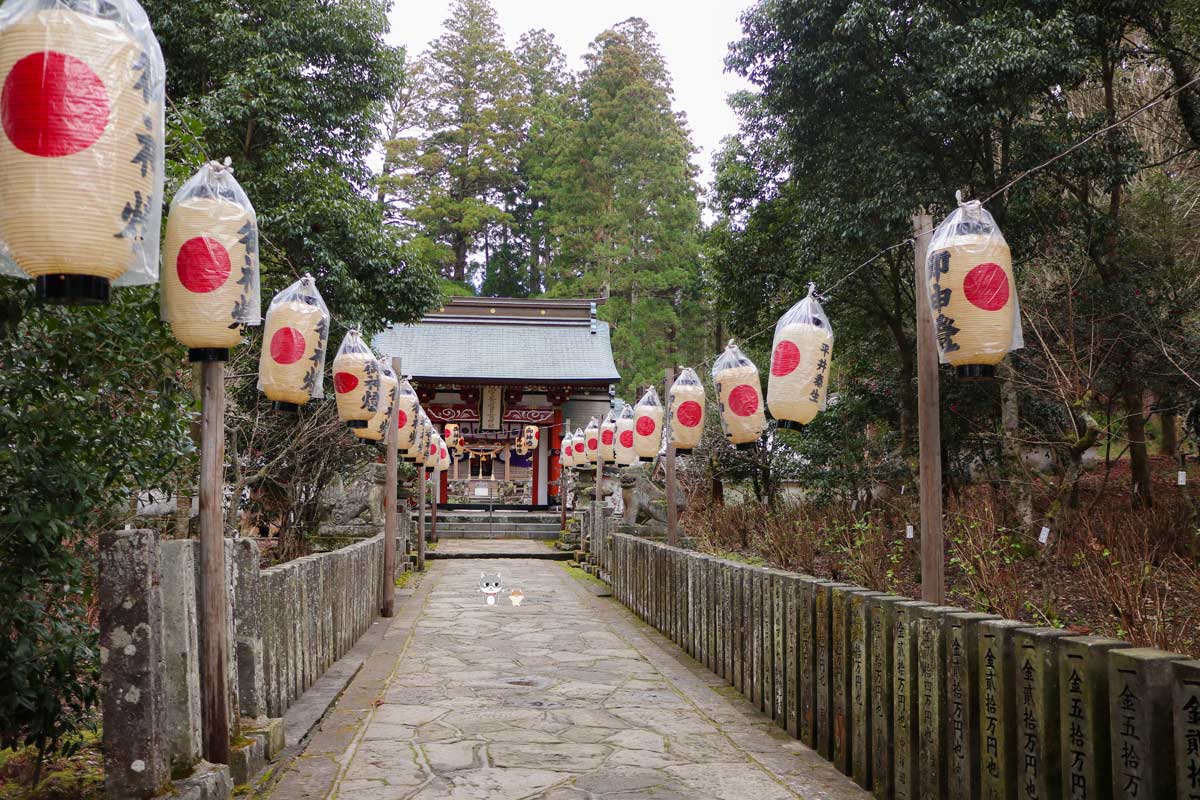 石畳が敷かれた参道には、日の丸が描かれた白い提灯がずらりと並ぶ。