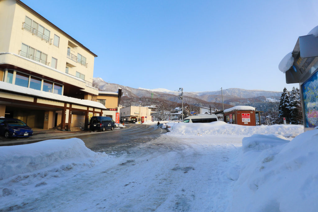 うっすらと白くなった遠くの山々を見て、改めて雪国に来たことを実感する…!
