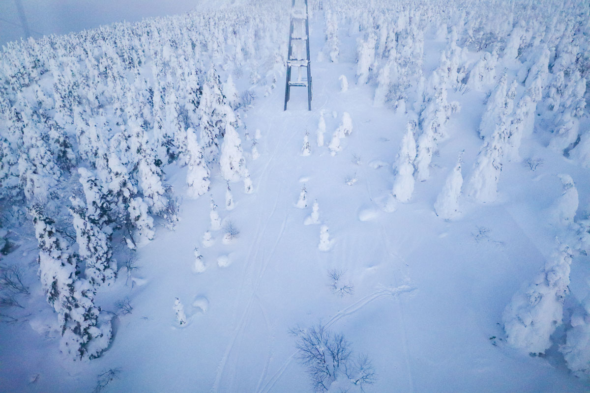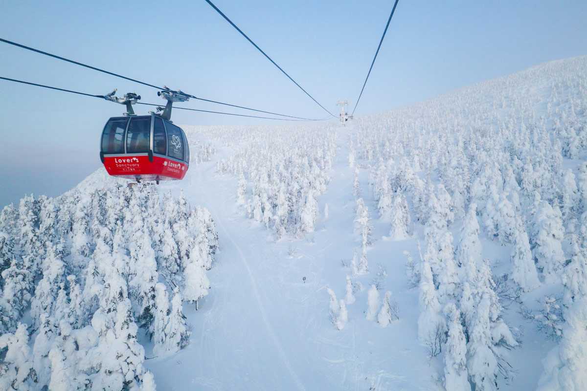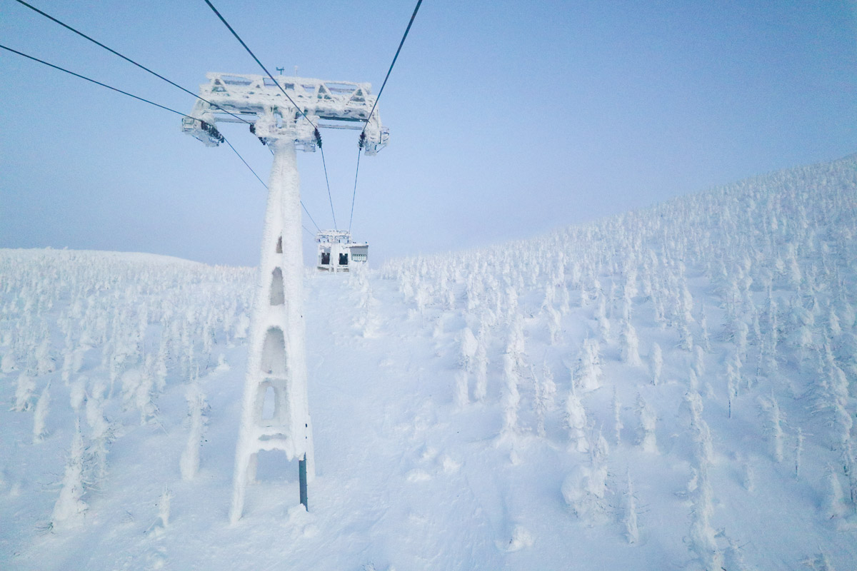 真っ白な樹氷の森の中に、赤いゴンドラが映える風景はこの場所ならでは。