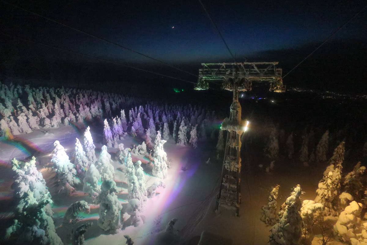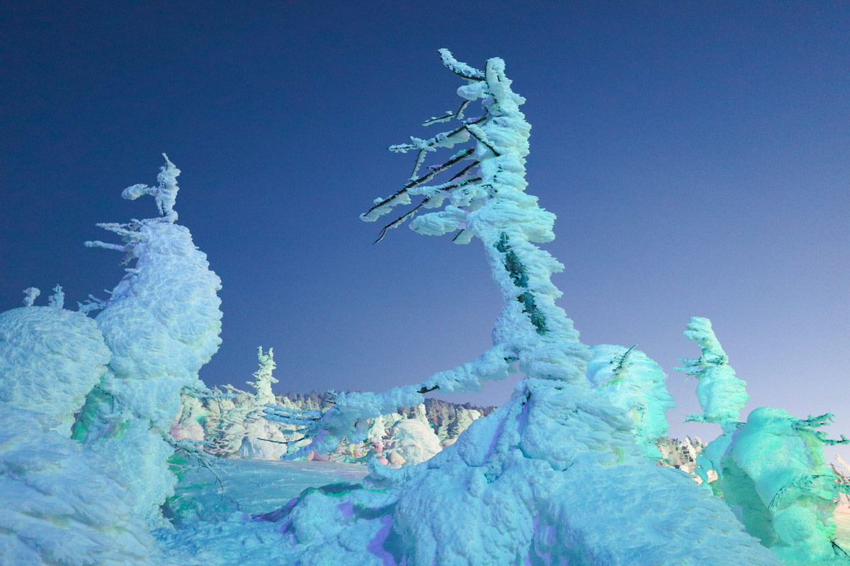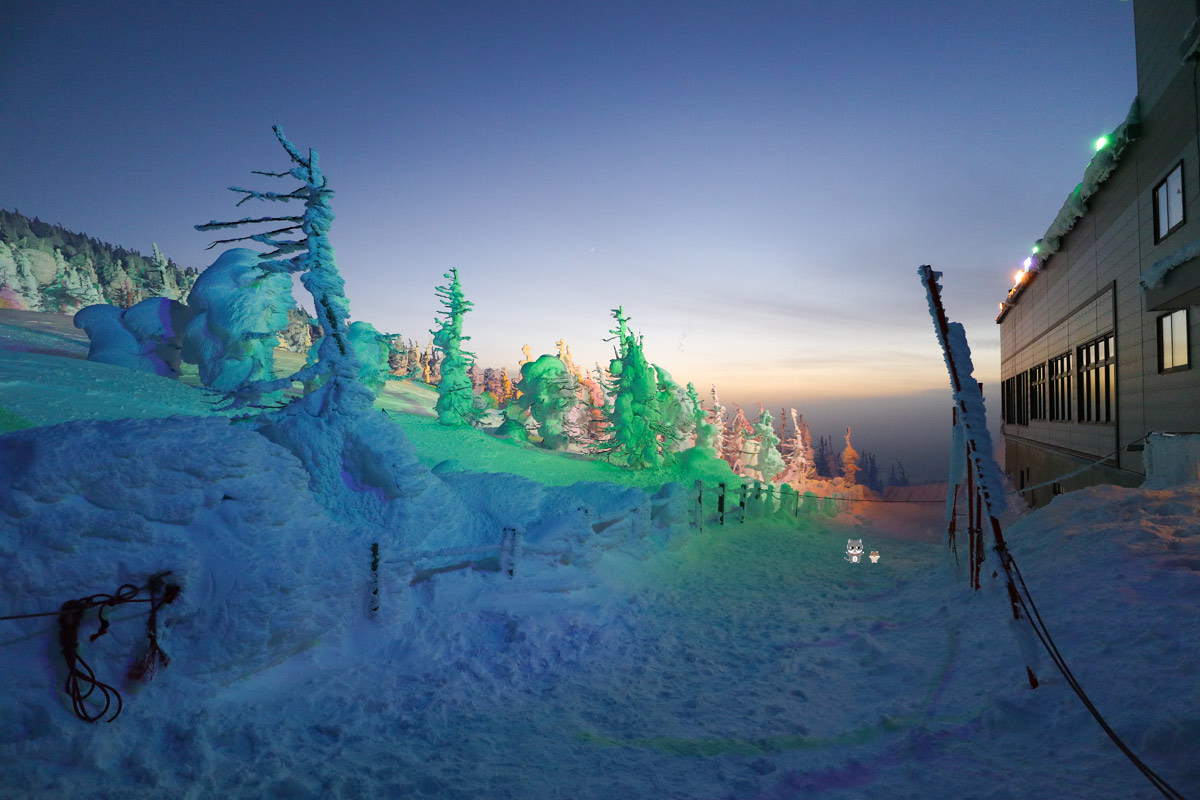 樹氷が色鮮やかなグリーンやオレンジに彩られて、より幻想的なムードに。