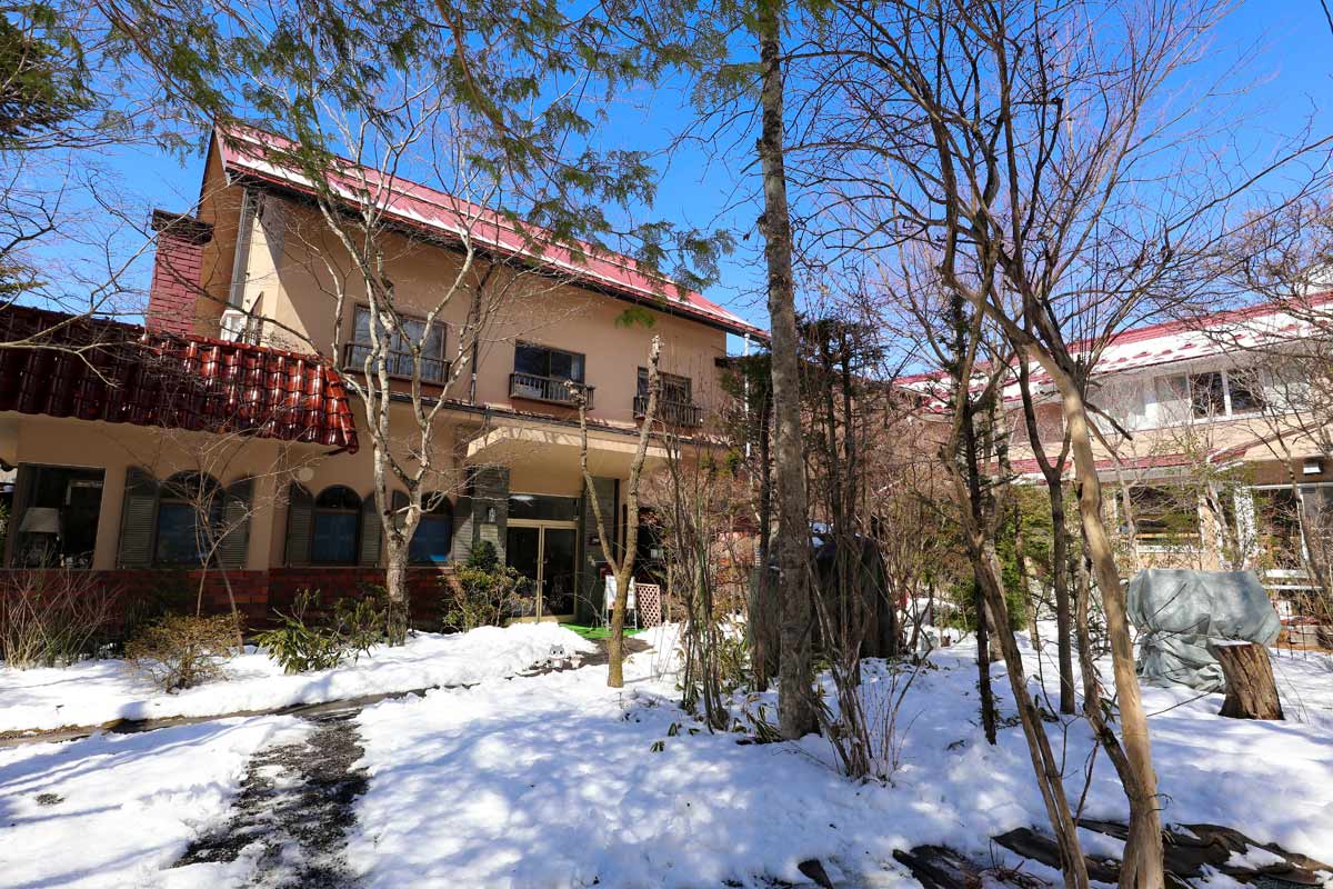 雪の残る庭の向こうに、ひっそりと隠れるように佇む。